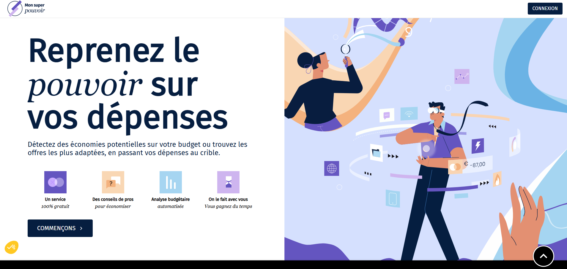 La page d’accueil devait faire en 5 secondes ce que beaucoup de fintech ratent en 5 pages. Expliquer clairement ce que fait l’outil. Rassurer sur la sécurité. Et créer l’envie d’essayer. Le webdesign a été construit autour d’un message central fort « Reprenez le pouvoir sur vos dépenses » et d’une illustration hero dynamique montrant l’utilisateur au centre de ses données. L’univers graphique (bleu profond, violet, accents lumineux) ancre Mon Super Pouvoir dans un territoire tech moderne, loin des codes trop bancaires ou trop « comparateur discount ». Chaque section de la page guide l’utilisateur vers une seule action : synchroniser son compte.