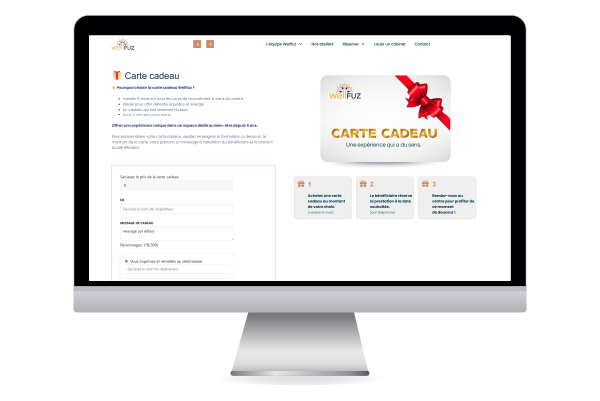 Wellfuz n’avait pas de boutique en ligne. Pas de moyen simple d’acheter ou d’offrir une prestation. WooCommerce a été mis en place sur le site WordPress existant pour permettre la vente directe de cartes cadeaux. Une illustration carte cadeau sur-mesure a été créée, cohérente avec l’univers visuel du centre, pensée pour donner envie d’offrir. Le parcours de paiement a été paramétré de bout en bout : page produit, tunnel d’achat, confirmation. Fluide, rassurant, mobile-first. Résultat : dès les premières fêtes, 50 cartes vendues. 2 000 € de chiffre d’affaires généré sur une période qui, avant, ne rapportait rien en ligne.